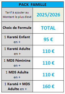 -> Le prix de la Cotisation Annuelle Club à l'association "Karaté Club Oloronais", en fonction du type d'activité(s) choisie(s) et de la tranche d'âge (voir détails sur la Fiche d'inscription KCO).